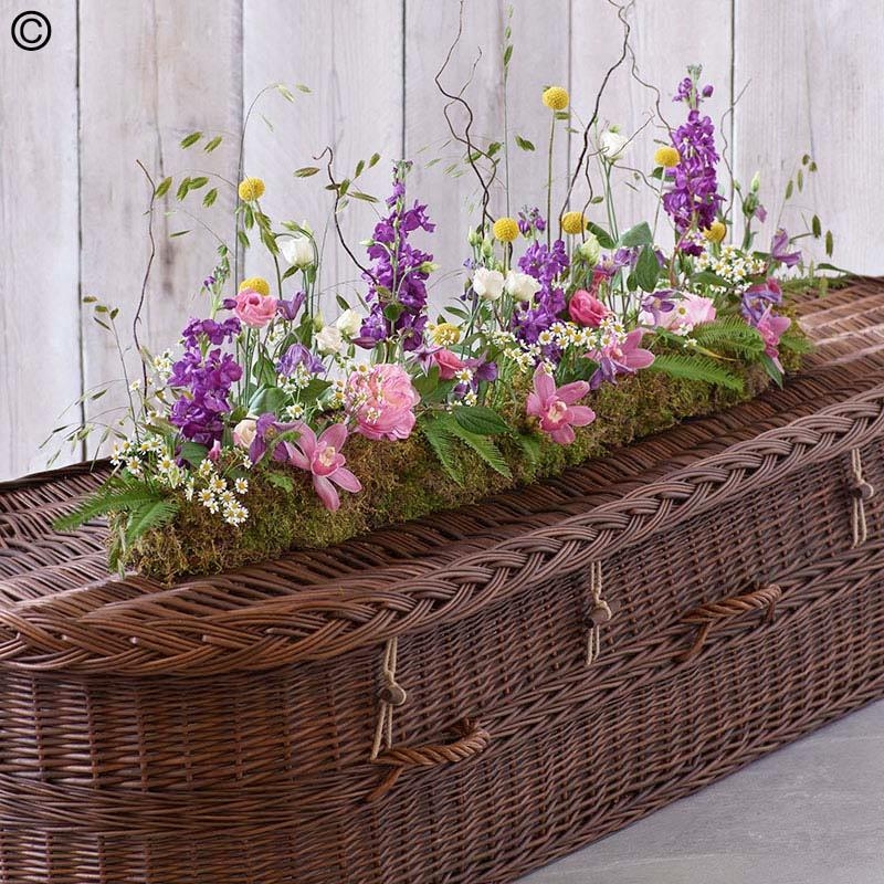 This natural-looking casket spray features a beautiful array of tones and blooms including craspedia, alliums, roses, and clematis. It's also made using a moss base, making it better for the environment.